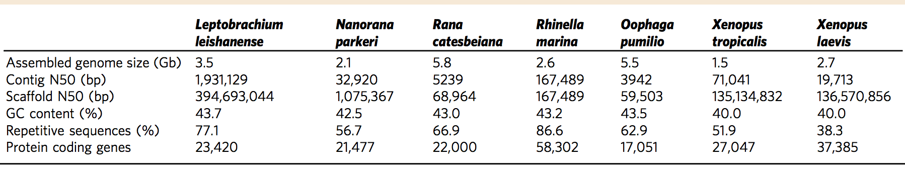 表1 雷山髭蟾與其它無尾目物種基因組比較