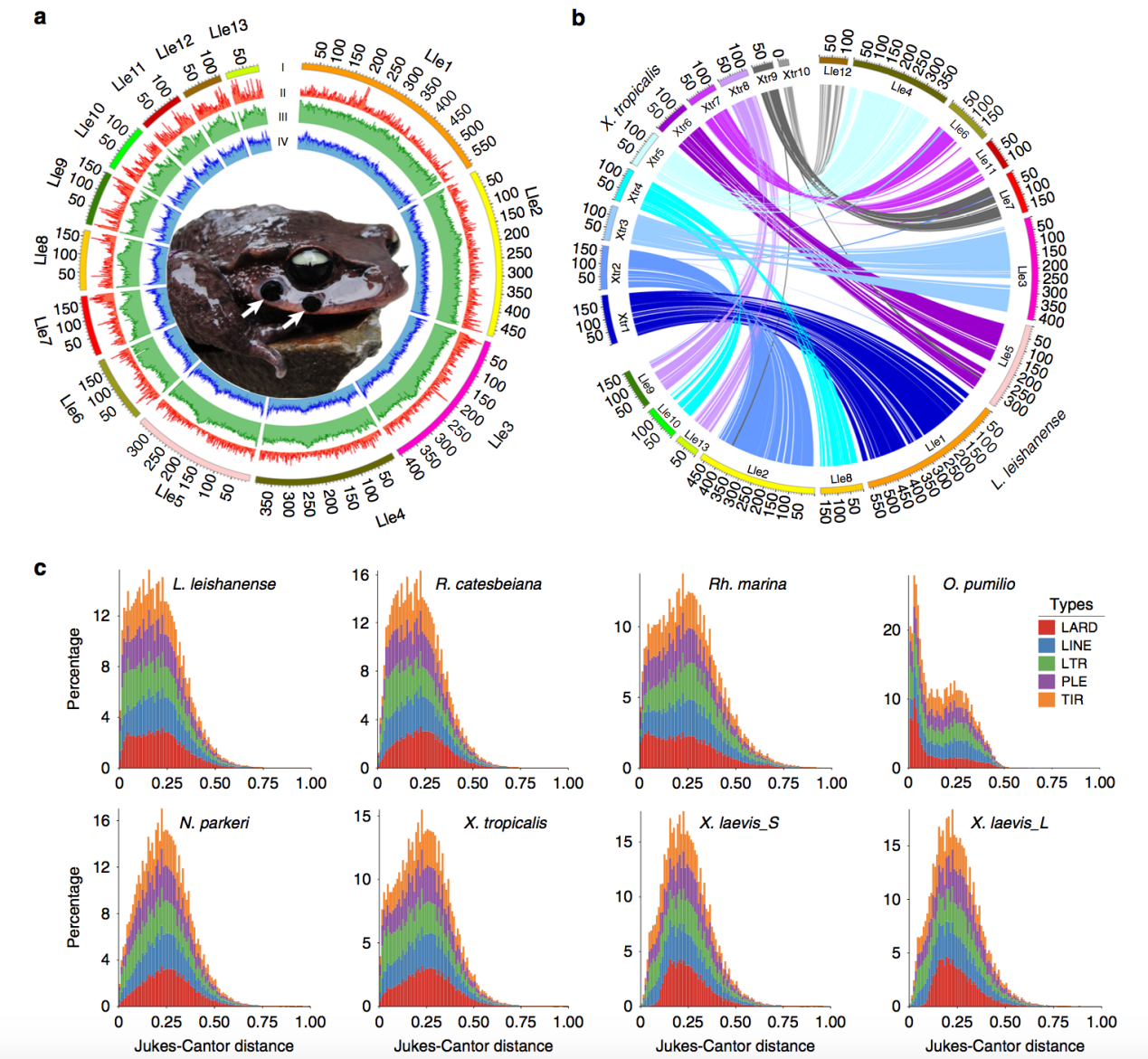 通過基因組共線性研究雷山髭蟾L. leishanense和熱帶爪蟾?X. tropicalis的基因組結(jié)構(gòu)特征。結(jié)果表明,兩個(gè)物種之間存在著大量的染色體共線性(圖4 b)。L. leishanense染色體數(shù)目是13,而?X. tropicalis的染色體數(shù)目是10,這種差異是源于L. leishanense的染色體分裂。X. tropicalis染色體(Xtr)4、7和8上的同源共線性區(qū)段分布在L. leishanense基因組中的兩個(gè)獨(dú)立染色體上(分別為Lle8+10、6+11和9+13)。在L. leishanense的基因組中,346個(gè)共線性區(qū)段中有179個(gè)倒位。經(jīng)PacBio reads驗(yàn)證,X. tropicalis的Xtr2、3、6、9、10等7個(gè)區(qū)域(502 Kb-5.9 Mb)易位到與相應(yīng)同源染色體不同的L. leishanense染色體上(圖5)。