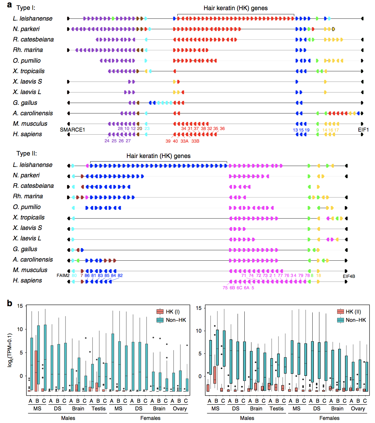 圖7 角蛋白基因家族的基因組分布和表達(dá)模式