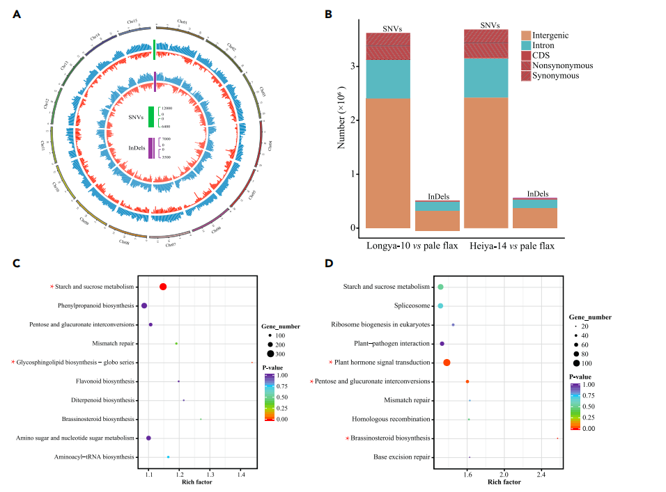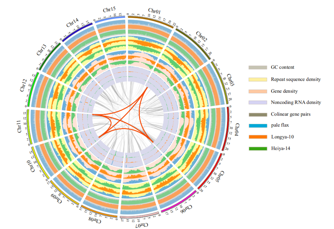 對(duì)油用亞麻品種Longya-10、纖維亞麻品種Heiya-14和pale flax分別測(cè)序得到68.2Gb,73.5Gb和 49.1Gb數(shù)據(jù),組裝出306.0Mb、303.7Mb和293.5 Mb基因組,其中contig N50/scaffold N50分別為131Kb/ 1,235Kb, 156Kb/700Kb和59Kb/384 Kb,后期利用HiC技術(shù)與遺傳圖譜輔助Longya-10基因組組裝,將434 scaffolds組裝至染色體水平,在每個(gè)基因組中預(yù)測(cè)到大約43,500個(gè)編碼基因和2600-2800個(gè)非編碼RNA;系統(tǒng)發(fā)育分析表明,栽培亞麻和白亞麻在大約232萬年前發(fā)生了分化,自古被子植物的六倍化事件以來,亞麻發(fā)生了兩次全基因組復(fù)制事件。