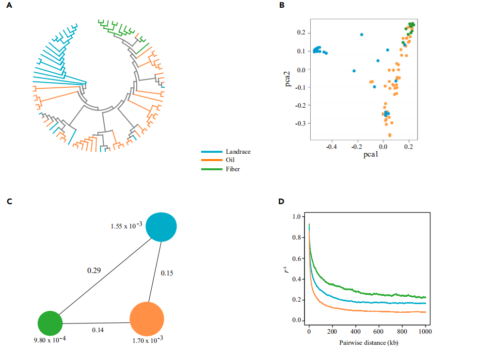 之前有報(bào)道纖維亞麻是從油用亞麻馴化而來,將油用亞麻與纖維亞麻進(jìn)行比較分析,存在47個(gè)選擇清除區(qū)域,其中50.9%與纖維亞麻相對(duì)于地方種的選擇區(qū)域重合。這表明在纖維用亞麻改良過程中,這些區(qū)域持續(xù)受到很強(qiáng)的選擇壓力。大約一半的基因(426/867個(gè)基因)僅在油用亞麻和纖維亞麻比較中發(fā)現(xiàn),包含內(nèi)切-β-1,4-葡聚糖酶(LuKorrigan)、果膠甲酯酶(LuPME)和焦磷酸銅合成酶(LuCPS)等。作者將選擇清除區(qū)域與之前報(bào)道的QTL/GWAS位點(diǎn)比較分析,發(fā)現(xiàn)2個(gè)硬脂酸相關(guān)的QTL與油用亞麻選擇區(qū)域重疊,一個(gè)株高相關(guān)的GWAS位點(diǎn)與纖維亞麻選擇區(qū)域重疊,另外3個(gè)油合成相關(guān)的QTL與纖維亞麻選擇區(qū)域重疊,這說明亞麻在馴化過程中受到雙重選擇。