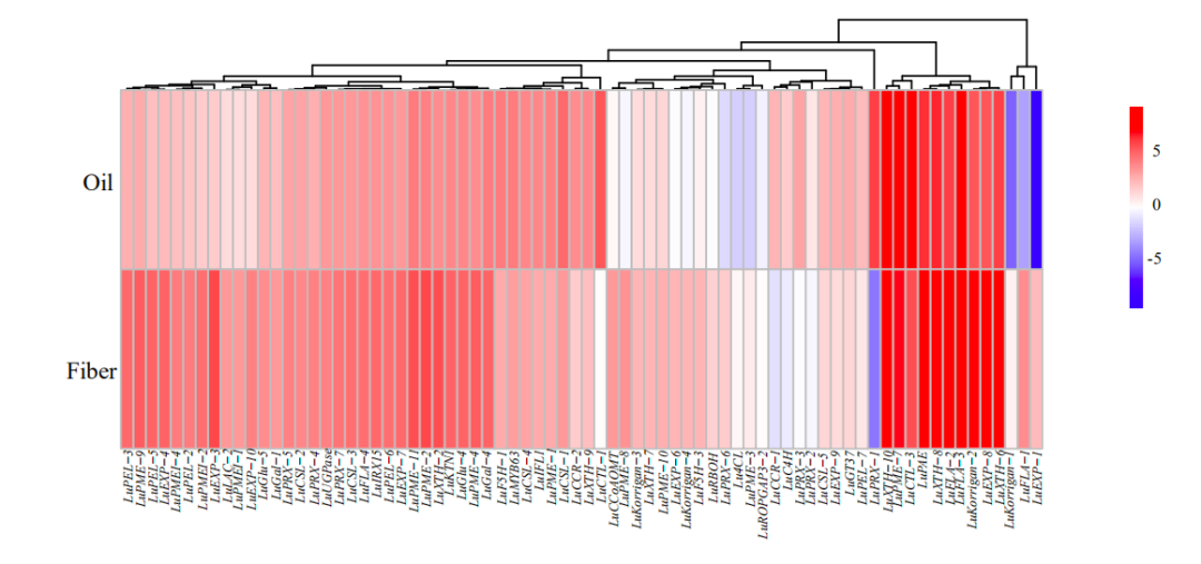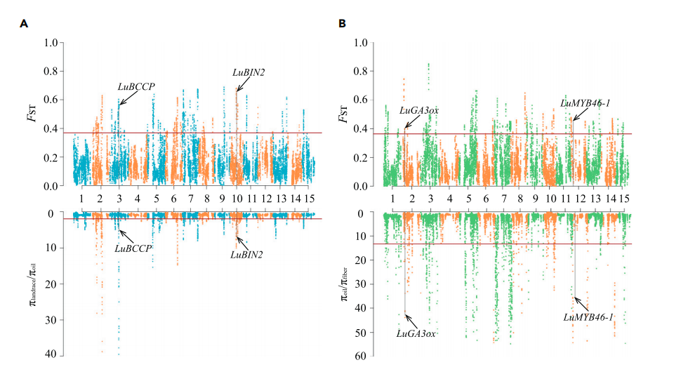 作物改良常常導(dǎo)致受選擇的區(qū)域核酸多態(tài)性降低,將油用亞麻群體和纖維亞麻群體分別與地方種比較分析,油用亞麻中檢測(cè)到108個(gè)選擇清除區(qū)域(長(zhǎng)度為15.5Mb,1,958個(gè)基因),纖維亞麻中有60個(gè)選擇清除區(qū)域(長(zhǎng)度為8.2Mb,1018個(gè)基因),27個(gè)選擇清除區(qū)域重疊。其中α生物素羧基載體蛋白(LuBCCP)、脂氧合酶(LuLOX)、脂肪酰基ACP硫酯酶A(LuFatA)、脂質(zhì)轉(zhuǎn)移蛋白(LuLTP)和丙酮酸脫氫酶復(fù)合物E2組分(LuPDH-E2)等油脂相關(guān)基因以及種子大小相關(guān)基因LuBIN2和LuGW5在油用亞麻中受到選擇。纖維亞麻中,次生細(xì)胞壁生物合成相關(guān)基因(LuMYB46-1、LuXTH和LuROPGAP3)和植物株高相關(guān)基因(LuGA3ox、LuGA20ox和LuGID)受到選擇。