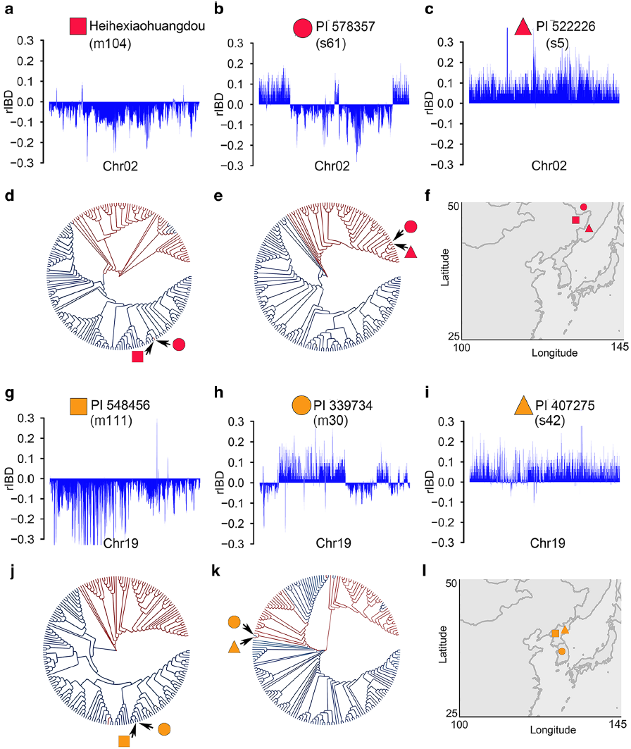 (a-c)黑河小黃豆, PI 578357和PI 52226三個材料中基因組成分在2號染色體的分布(d)基于2號染色體基因滲入?yún)^(qū)域SNP構(gòu)建的進(jìn)化樹揭示的PI 578357中PI 52226成分的起源(e)基于2號染色體非基因滲入?yún)^(qū)域SNP構(gòu)建的進(jìn)化樹揭示的PI 578357中黑河小黃豆成分的起源(f)上述三個材料的地理分布(g-i) PI 548456, PI 339734和PI 407275三個材料中基因組成分在19號染色體的分布(j)基于19號染色體基因滲入?yún)^(qū)域SNP構(gòu)建的進(jìn)化樹揭示的PI 339734中PI 548546成分的起源(k)基于19號染色體非基因滲入?yún)^(qū)域SNP構(gòu)建的進(jìn)化樹揭示的PI 339734中PI 407275成分的起源(l)上述三個材料的地理分布
