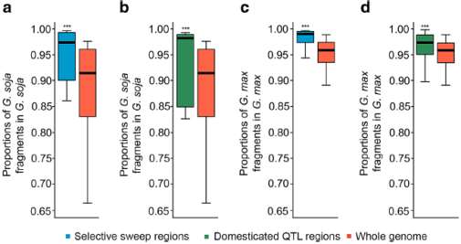 相較于在野生大豆種質(zhì)中檢測到的基因組其他區(qū)域,與選擇性掃描區(qū)域相應(yīng)區(qū)域中的栽培大豆片段比例顯著降低(圖5a)。相比之下,與栽培大豆基因組相比,選擇性掃除區(qū)中野生大豆片段在基因組其他區(qū)域的檢出率顯著降低(圖5c)。在栽培大豆或野生大豆相應(yīng)馴化QTL區(qū)域中,滲入片段比例比選擇性掃描區(qū)域中檢測到的?。▓D5b,d)。這些結(jié)果表明雙向選擇,即自然選擇與人工選擇,對野生大豆和栽培大豆中滲入片段的保留具有不同的結(jié)果、影響。