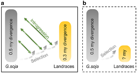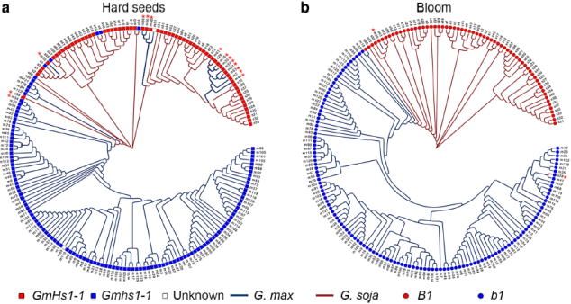 基因滲入被認(rèn)為是基因流的主要途徑,那么基因流如何在種群水平上影響馴化過程和大豆基因組的遺傳結(jié)構(gòu)?現(xiàn)有研究已分離出分別控制種子硬度和種皮開花的關(guān)鍵大豆馴化基因GmHs1-1和Bloom1(B1),圍繞GmHS1-1、Gmhs1-1和B1、b1基因座的兩個選擇性掃除區(qū)域中的SNP分析系統(tǒng)發(fā)育關(guān)系發(fā)現(xiàn)基因滲入現(xiàn)象在這兩個區(qū)域均有存在。考慮到野生大豆和栽培大豆亞種的系統(tǒng)發(fā)育差異,在研究種群中兩個馴化基因位點(diǎn)檢測到的選擇性掃描區(qū)域和單倍型的混合將被視為亞種群間基因流動的進(jìn)一步證據(jù)。