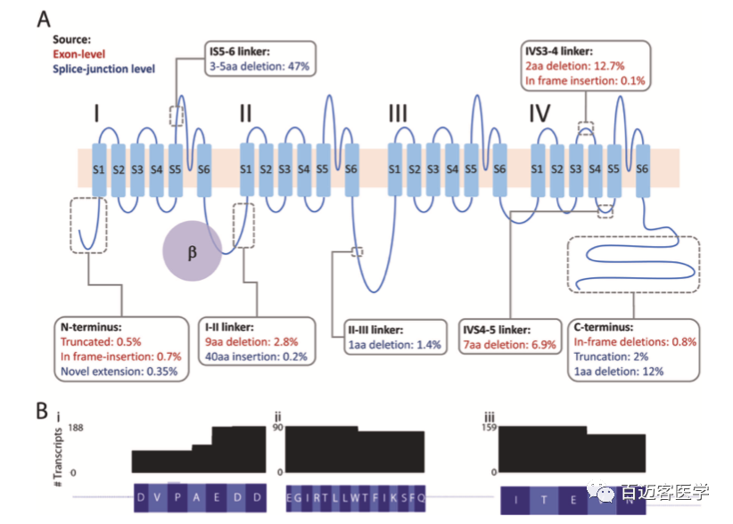 CACNA1C編碼CaV1.2 的主要成孔亞基。鈣孔由24個(gè)跨膜重復(fù)序列組成,由細(xì)胞內(nèi)環(huán)連接成4個(gè)結(jié)構(gòu)域(I-IV)(圖4A)。在我們鑒定的83個(gè)新的外顯子水平的轉(zhuǎn)錄本中,51個(gè)可能編碼功能性的CaV1.2通道?;疑娇虮硎拘碌?、框架內(nèi)的插入和刪除的位置(值表示包含每個(gè)isoforms的reads的平均比例)。使用兩種分析方法(外顯子水平和剪切連接水平)鑒定變體的情況,外顯子水平計(jì)數(shù)用于得出豐度(紅色文本);僅使用剪接位點(diǎn)水平方法鑒定的變體用藍(lán)色文本表示。包含三個(gè)微缺失的蛋白質(zhì)異構(gòu)體的數(shù)量:(I)在I-II接頭中,(Ii)在IV4-5接頭中,以及(Iii)在IV3-4接頭中先前報(bào)道的微缺失(圖4B)。