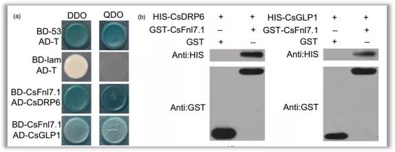 利用酵母雙雜技術(shù),以CsFnl7.1蛋白為誘餌篩選與其互做的蛋白,結(jié)果顯示共得到53個陽性克隆,在這些蛋白中有多個與細(xì)胞伸展相關(guān),包括CsDRP6和CsGLP1(圖8a)。體外pull down實驗顯示,融合蛋白HIS-CsDRP6和HIS-CsGLP1可以被GST-CsFnl7.1高效捕獲,而對照GST則不能(圖8b)。以上結(jié)果充分說明CsFnl7.1與CsDRP6、CsGLP1之間存在互做關(guān)系。