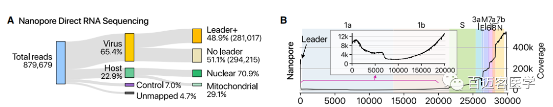 這篇文章結(jié)合了兩種測(cè)序方法,Direct RNA sequencing (DRS)和sequencing-by-synthesis (SBS),明確地繪制了SARS-CoV-2的亞基因組RNA(subgenomic RNAs),ORF和轉(zhuǎn)錄調(diào)控序列(TRS)。同時(shí)發(fā)現(xiàn)了許多與常規(guī)TRS介導(dǎo)的聚合酶跳躍不同的非常規(guī)RNA融合事件。發(fā)現(xiàn)了RNA修飾位點(diǎn),并測(cè)量了gRNA和sgRNA的poly(A)的長(zhǎng)度。