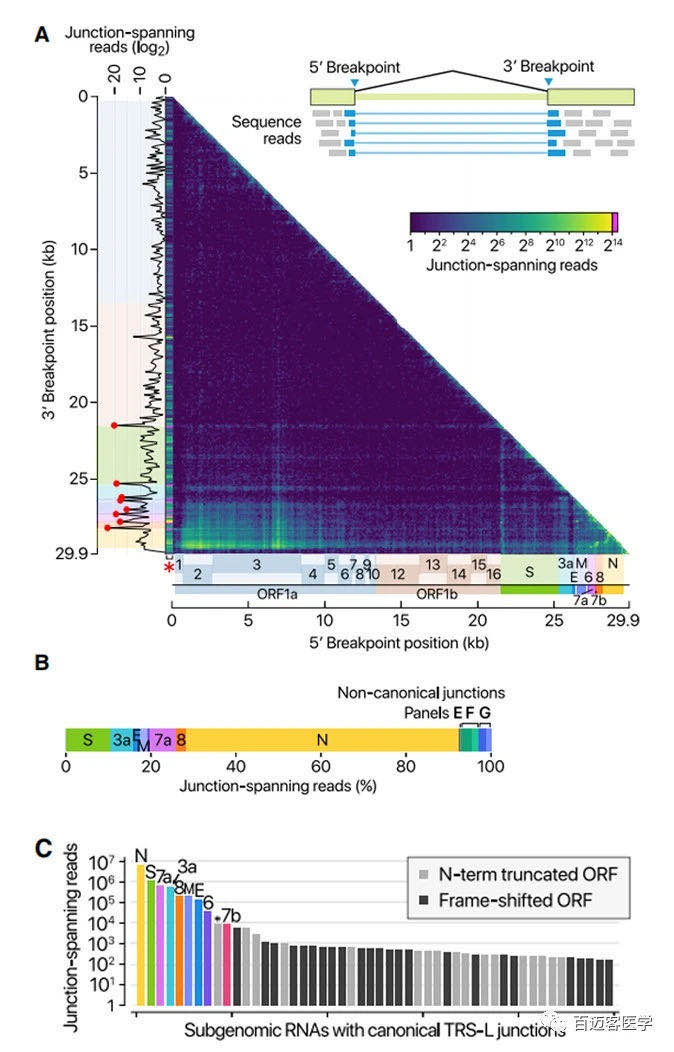 用DNB-seq確認(rèn)和檢查CoV基因組的junctions。在junctions處繪制了5’和3’斷點(diǎn),并通過(guò)計(jì)算跨越j(luò)unctions的reads來(lái)估算融合頻率(圖2A)。如所預(yù)期的,leader代表了最突出的5’ 位點(diǎn)(圖2A,x軸上的紅色星號(hào))。TRS-B被檢測(cè)為3’位點(diǎn)的頂端(圖2A,y軸上的紅點(diǎn))。這些結(jié)果證實(shí),SARS CoV-2使用標(biāo)準(zhǔn)的TRS介導(dǎo)的模板轉(zhuǎn)換機(jī)制進(jìn)行不連續(xù)轉(zhuǎn)錄,以產(chǎn)生主要的sgRNA(圖2B)??缭絡(luò)unctions reads的定量比較顯示,N RNA是表達(dá)最豐富的轉(zhuǎn)錄本,其次是S,7a,3a,8,M,E,6和7b(圖2C)。