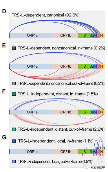 SARS-CoV-2除了具有預(yù)期結(jié)構(gòu)和長(zhǎng)度的經(jīng)典sgRNA(圖4D),結(jié)果還顯示出許多次要的junction sites(圖4E–4G)。這種融合事件有三種主要類(lèi)型。第一組中的RNA在位于ORF或UTR中間非預(yù)期的3’位點(diǎn),前導(dǎo)序列(leader)與下游編碼序列(body)結(jié)合(圖4E,TRS-L-dependent noncanonical)。第二組顯示了與前導(dǎo)序列沒(méi)有相似性的序列之間的遠(yuǎn)距離融合(圖4F, TRS-L-independent distant)。最后一組局部融合,這導(dǎo)致較小的缺失,主要發(fā)生在結(jié)構(gòu)基因和輔助基因中,包括S ORF(圖4G,TRS-L-independent local recombination)。