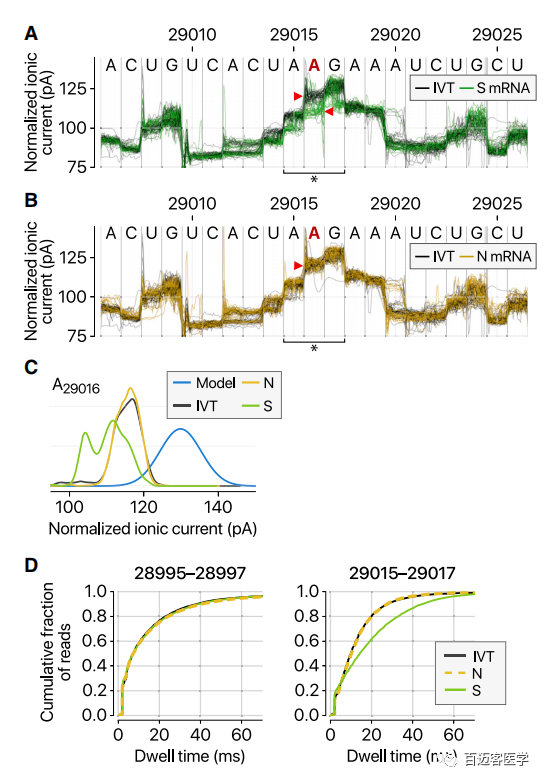 研究人員用DRS數(shù)據(jù)檢測(cè)了SARS-CoV-2的表觀轉(zhuǎn)錄組學(xué)。病毒RNA修飾在40多年前就已描述過(guò)(Gokhale and Horner,2017)。為了明確研究RNA修飾,作者通過(guò)體外轉(zhuǎn)錄病毒序列生成了陰性對(duì)照RNA,并對(duì)陰性對(duì)照進(jìn)行了直接RNA測(cè)序。注意到陰性對(duì)照和病毒轉(zhuǎn)錄本之間的離子電流之間的差異非常有趣(圖6A)。至少有41個(gè)位點(diǎn)顯示出實(shí)質(zhì)性差異(頻率超過(guò)20%),表明存在潛在的RNA修飾位點(diǎn)。值得注意的是,某些位點(diǎn)顯示的頻率取決于sgRNA的種類(lèi)。圖6A–6C,S RNA上比N RNA修飾的位點(diǎn)更多,與S RNA相比ORF8 RNA上的修飾頻率更高。此外,修飾的堿基(圖6D,右)的停留時(shí)間比未修飾的堿基(圖6D,左)的停留時(shí)間長(zhǎng),表明修飾會(huì)干擾RNA分子過(guò)孔速度。