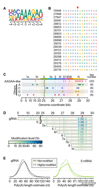 在41個(gè)潛在的修飾位點(diǎn)中,最常見(jiàn)的motif是AAGAA(圖7A和7B)。在整個(gè)病毒基因組中都發(fā)現(xiàn)了“AAGAA-like”motif的修飾位點(diǎn)(包括AAGAA和其他富含A/G的序列),尤其是在基因組28,500-29,500處特別豐富(圖7C)。病毒長(zhǎng)的轉(zhuǎn)錄本(gRNA,S,3a,E和M)比短RNA(6、7a,7b,8和N)的修飾頻率更高(圖7D),表明該修飾是特定于某些RNA種類(lèi)。因?yàn)镈RS可以同時(shí)檢測(cè)單個(gè)分子上的多個(gè)特征,所以作者交叉檢測(cè)了poly(A)尾長(zhǎng)和內(nèi)部修飾位點(diǎn)。有趣的是,修飾的RNA分子的poly(A)尾比未修飾的短(圖7E)。這些結(jié)果表明內(nèi)部修飾和3’尾之間存在聯(lián)系。由于poly(A)尾巴在RNA周轉(zhuǎn)中起重要作用,因此很容易推測(cè)所觀察到的內(nèi)部修飾與病毒RNA穩(wěn)定性控制有關(guān)。