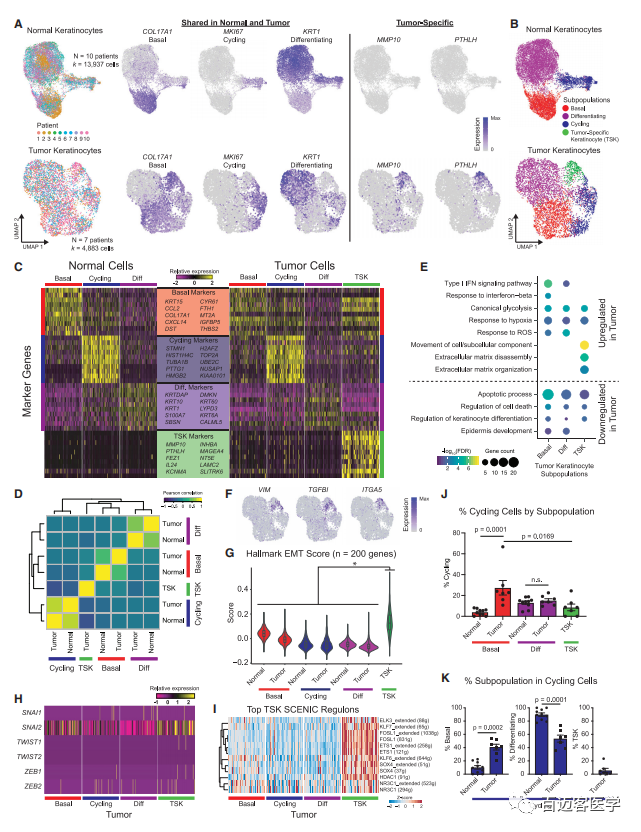 重新聚類正常上皮細胞后,在正常皮膚中觀察到3個主要的角質(zhì)細胞(KC)亞群(基底、循環(huán)、分化細胞)。典型相關(guān)分析表明腫瘤KCs廣泛重現(xiàn)了正常(基底、循環(huán)、分化細胞)亞群,在正常皮膚和cSCC中有幾個共享的標(biāo)記基因(圖2A-D)。有趣的是,在腫瘤細胞聚類中出現(xiàn)了與正常皮膚無明顯關(guān)聯(lián)的第四個KC亞群,即TSK亞群(圖2B-D)。事實上,在這一簇與其他腫瘤細胞區(qū)別開來的100個基因中,有99個基因在腫瘤組織中的表達明顯高于正常組織。TSK標(biāo)記基因與細胞運動和細胞外基質(zhì)分解有關(guān),暗示了它的侵入性(圖2E)。TSKs表達經(jīng)典的上皮-間質(zhì)轉(zhuǎn)化(EMT)標(biāo)志物,如VIM和ITGA5(圖2F);但是EMT類似的TSK細胞缺乏經(jīng)典表達EMT轉(zhuǎn)錄因子(圖2H)。因此,我們通過單細胞調(diào)控網(wǎng)絡(luò)進行推理和聚類,提名AP1和ETS家族成員為潛在控制TSKs的TFs(圖2I)。TSK細胞也表現(xiàn)出較大的EMT評分范圍,提示細胞狀態(tài)具備高可塑性(圖2G),與EMT連續(xù)模型一致。基底細胞(Basal)在腫瘤中的發(fā)生率約是正常循環(huán)細胞的四倍(圖2K)??偟膩碚f,cSCC表現(xiàn)出分化失常,基底細胞迅速增殖,并出現(xiàn)表達EMT連鎖基因的TSK亞群。