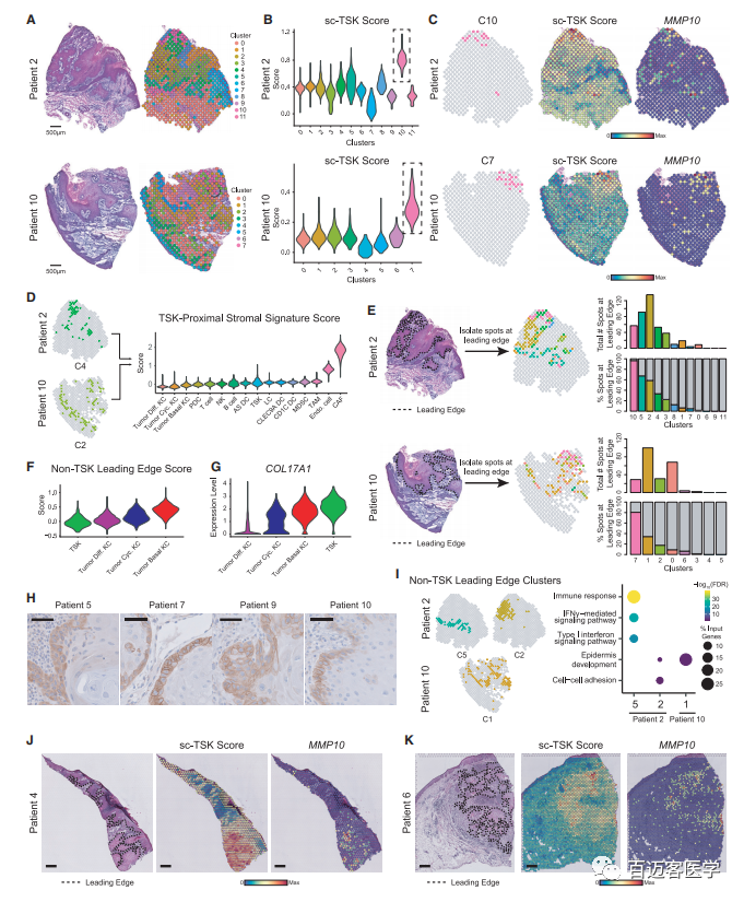 在患者中,腫瘤相關(guān)的斑點簇展現(xiàn)出單細胞測序腫瘤KCs的定位基因表達,同時免疫或間質(zhì)基因與腫瘤臨近間質(zhì)、未受累的間質(zhì)或附件區(qū)域有關(guān)聯(lián),與大體的cSCC結(jié)構(gòu)一致(圖3A)。使用scRNA-seq中TSK標(biāo)記基因?qū)γ總€空間轉(zhuǎn)錄組斑點評分,顯著突出了一個TSK-high簇,包括TSK標(biāo)記物MMP10(圖3B&C)。在具有清晰前沿的腫瘤中,TSK鄰近間質(zhì)富集了癌癥相關(guān)成纖維細胞 (CAF)和內(nèi)皮細胞轉(zhuǎn)錄本,表明TSK細胞主要位于纖維血管微環(huán)境中(圖3D)。超過80%的TSK高簇點位于腫瘤前沿,其余的前沿點富集了Basal腫瘤基因(圖3E&F),這種共存關(guān)系通過共表達標(biāo)志物COL17A1的免疫組化得到進一步確認(圖3G&H)。此外,炎癥反應(yīng)和干擾素信號基因在非TSK前沿表達,與干擾素相關(guān)轉(zhuǎn)錄本在腫瘤基底群體中的存在一致(圖2E&I)。這些結(jié)果確定了TSK、Basal細胞以及TSK近端纖維血管生態(tài)位造成的cSCC腫瘤前沿的異質(zhì)性。