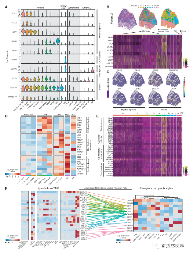 為了探究何種細胞類型影響了cSCC的免疫活動,我們調(diào)查了熟知的免疫抑制基因(圖4A),CD274(PD-L1)和PDCD1LG2(PD-L2)等基因在ST中表現(xiàn)出空間簇特異性模式,與特定細胞類型的共定位一致,骨髓特異性因子在炎癥前沿占據(jù)優(yōu)勢地位(圖4B&C)。衰竭的CD4和CD8 T細胞亞群除表達細胞毒性基因外,還表達抑制性受體和衰竭標(biāo)志物(圖4D)。在空間位置上,T細胞轉(zhuǎn)錄本出現(xiàn)在炎癥前沿和免疫相關(guān)細胞簇中(圖4E)。并且發(fā)現(xiàn)scRNA-seq中幾種趨化因子受體在重疊的T細胞亞群中高表達。Tregs特異性表達CCR8,這可能是一個潛在藥物靶點(圖4F)。綜上所述,這些結(jié)果強調(diào)了參與免疫抑制機制的多種細胞類型,包括誘導(dǎo)DC和衰竭T細胞共抑制信號,以及招募Tregs。