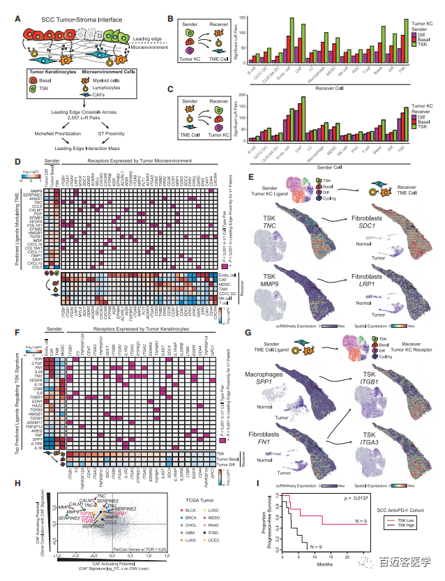 進一步,我們整合scRNA-seq和ST數(shù)據(jù)來描述前沿鄰近腫瘤和TME細胞之間的信號通路(圖6A)?;谂潴w-受體對數(shù)據(jù)庫,TSKs廣參與了自分泌和旁分泌相互作用(主要與CAFs、內(nèi)皮細胞、巨噬細胞和MDSCs)(圖6B&C)。我們使用NicheNet和ST對前沿預(yù)測為調(diào)節(jié)TME特異性細胞類型標(biāo)記的腫瘤KC配體進行優(yōu)先排序。與TSK-纖維血管生態(tài)位一致的是,對CAFs的顯著TSK信號通路是由幾對TSK-CAF配體-受體對介導(dǎo)的,包括MMP9-LRP1和TNC-SDC1(圖6D&E)。此外,TSKs可通過配體-受體對(PGF-FLT1、PGF-NRP2和EFNB1-EPHB4)調(diào)節(jié)內(nèi)皮細胞。相反地,內(nèi)皮細胞和CAFs顯著共表達NicheNet預(yù)測配體,如TFPI, FN1,和THBS1,這些與TSK受體匹配(圖6F&G)。進一步證實TSKs是一種類似EMT的群體。為了判定TSK細胞是否與多變的TME普遍關(guān)聯(lián),我們調(diào)研了TCGA數(shù)據(jù)庫中31種實體瘤數(shù)千個轉(zhuǎn)錄組數(shù)據(jù)。我們進一步判定TSK配體是否誘導(dǎo)CAF基因(1)伴隨配體CNV缺失,減少CAF基因表達;(2)配體表達和CAF基因的關(guān)聯(lián)(圖6H),這個在過往研究中被證實。另外TSK細胞可以抑制抗腫瘤免疫。雖然這些研究還不明確TSK細胞是內(nèi)在抵抗還是免疫調(diào)節(jié)活性起作用,但這個亞群提供了一個提高免疫治療的目標(biāo)方向。