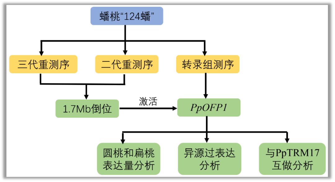 那么同樣是桃子,為什么蟠桃是扁的呢?近日,國際知名期刊Plant Biotechnology Journal(IF=8.15)在線發(fā)表了中科院武漢植物園韓月彭老師課題組及其合作單位共同的研究成果“1.7-Mb chromosomal inversion downstream of a PpOFP1?gene is responsible for flat fruit?shape in peach”,該研究發(fā)現(xiàn)在蟠桃基因組中存在1個(gè)1.7Mb的倒位,而該變異會(huì)激活其附近的基因PpOFP1表達(dá),導(dǎo)致蟠桃扁平果實(shí)。在該研究中,大片段的結(jié)構(gòu)變異的檢測(cè)是分析的基礎(chǔ),而三代測(cè)序技術(shù)能夠高效地助力大片段倒位的發(fā)現(xiàn)。今天大師兄為大家奉上文章解讀,以饕讀者。