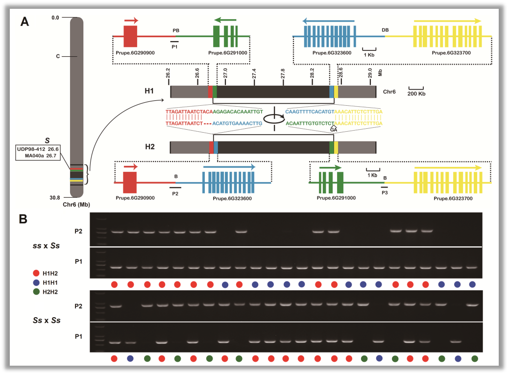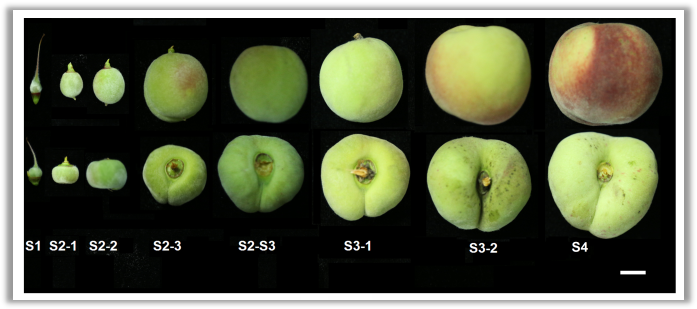 桃起源于250萬年前的中國青藏高原的西南部,在中國已有4000年的栽培史,其中有一個(gè)獨(dú)特變種—蟠桃,蟠桃果實(shí)呈扁平狀,體積較小,和我們常見的圓形桃子有明顯區(qū)別,雖然長(zhǎng)相一般,不過它具有酸度低、糖含量高等優(yōu)異品質(zhì),受到越來越多的消費(fèi)者喜愛。蟠桃果實(shí)扁平的特征受6號(hào)染色體上的S位點(diǎn)調(diào)控,同時(shí)S位點(diǎn)與控制鮮重和果實(shí)敗育位點(diǎn)緊密連鎖。關(guān)于S位點(diǎn)的基因定位研究有多次報(bào)道,發(fā)現(xiàn)2個(gè)臨近候選基因(CAD1LRR-RLK)與果實(shí)扁平的性狀共分離,但后續(xù)又有研究顯示這2個(gè)基因并非與CAD1LRR-RLK共分離。所以,對(duì)于扁桃扁平性狀的遺傳基礎(chǔ)研究仍待繼續(xù)。