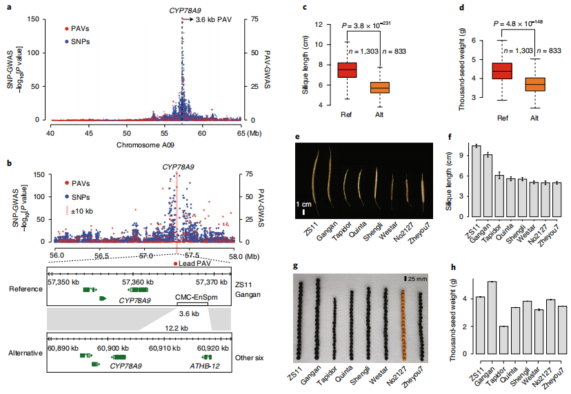 泛基因組可以結(jié)合GWAS數(shù)據(jù),有效提高GWAS 的準(zhǔn)確性,捕獲到更加完整的遺傳變異信息。通常,GWAS分析是將個(gè)體材料與參考基因組進(jìn)行比對(duì),然后將得到的 SNP 與表型進(jìn)行關(guān)聯(lián)分析,當(dāng)GWAS 分析參考基因組不存在的功能基因引起的表型時(shí),會(huì)出現(xiàn) GWAS 定位區(qū)間與實(shí)際功能基因之間較大偏差甚至檢測(cè)不到的情況。但以泛基因組為參考基因組,把結(jié)構(gòu)變異作為基因型數(shù)據(jù)用于 GWAS 分析,可以有效解決這類因單一參考基因組而導(dǎo)致的信息不全問(wèn)題。例如,油菜以泛基因組鑒定到的 PAV 為基因型進(jìn)行GWAS 分析,直接鑒定到基因BnaA9.CYP78A9啟動(dòng)子區(qū)存在一段 3.9 kb 的插入,該變異嚴(yán)重影響油菜的角果長(zhǎng)和粒重[2]。結(jié)構(gòu)變異相關(guān)的GWAS研究更具有新意,也是后續(xù)研究的熱點(diǎn)。