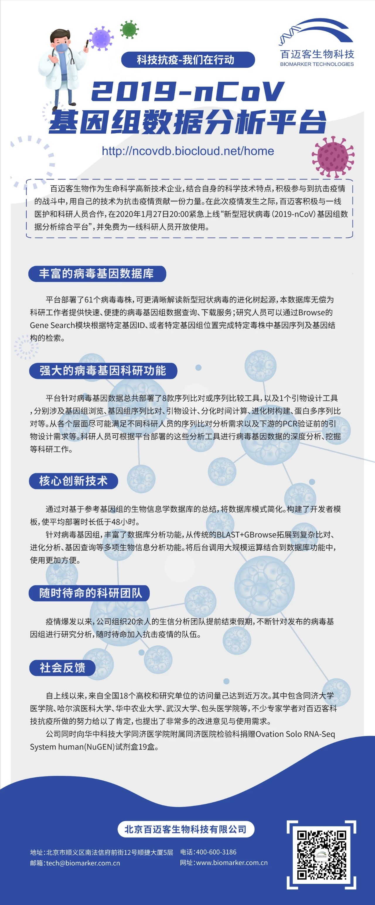在疫情防控這個(gè)特殊的戰(zhàn)場(chǎng),百邁客作為三代測(cè)序和生物云-BMKCloud服務(wù)提供商,結(jié)合自身的技術(shù)特點(diǎn),在疫情爆發(fā)初期積極的參與到抗擊疫情的戰(zhàn)斗中,與一線的醫(yī)護(hù)和科研人員合作,結(jié)合一線的需求,積極調(diào)動(dòng)各種資源,經(jīng)過十幾天夜以繼日的開發(fā),通過對(duì)各數(shù)據(jù)庫(kù)中的新型冠狀病毒數(shù)據(jù)進(jìn)行合理整合分析,于2020年1月27日20:00時(shí)及時(shí)上線了首版“2019-nCoV新型冠狀病毒基因組數(shù)據(jù)分析平臺(tái)”(http://ncovdb.biocloud.net/home)?。本數(shù)據(jù)庫(kù)配合國(guó)家公共資源數(shù)據(jù)庫(kù)為社會(huì)提供更全面、及時(shí)、準(zhǔn)確的數(shù)據(jù)資源。為我們的一線科研人員提供免費(fèi)服務(wù)。