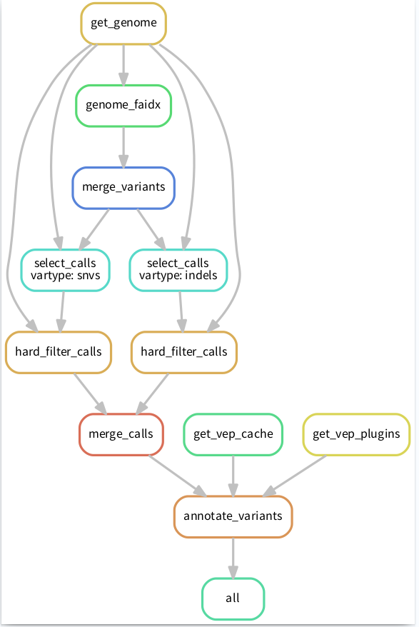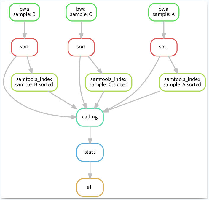 這時(shí)候就需要 Snakemake 閃亮登場了,因?yàn)閟nakemake可能是處理這類問題最簡單、有效的一個(gè)方法了。比如將流程像下圖這樣搭建起來,清晰明了: