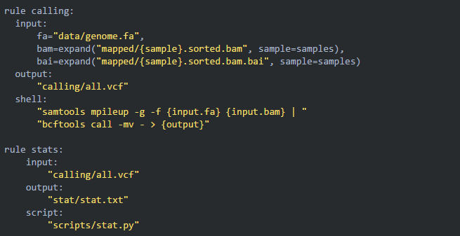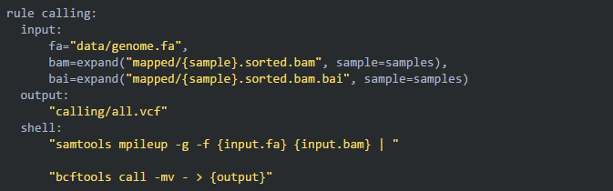 前面三步都是各個(gè)樣品批量、并行運(yùn)行同樣的步驟,所以可以全部使用通配符 {sample} 完成匹配;但在變異檢測這一步需要將所有樣本的bam文件傳遞給一個(gè)命令而不再并行,這種方法就不在適用了。針對(duì)這種情況,snakemake 有它獨(dú)特的解決辦法: