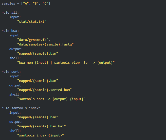 Snakemake 是基于 Python 的一款工具,所以它也繼承了 Python 語言簡單易讀、邏輯清晰、便于維護(hù)的特點(diǎn),同時(shí)它還支持 Python 語法,非常適合新手用戶。snakemake 的基本組成單位叫“規(guī)則”,即 rule;每個(gè) rule 里面又有多個(gè)元素(input、output、run等)。它的執(zhí)行邏輯就是將各個(gè) rule 利用 input/output 連接起來,形成一個(gè)完整的工作流,當(dāng)檢測到 input,就執(zhí)行相應(yīng) rule;檢測到 output,就跳過相應(yīng)rule,根據(jù)這一規(guī)則,snakemake 還可以實(shí)現(xiàn)斷點(diǎn)續(xù)投。