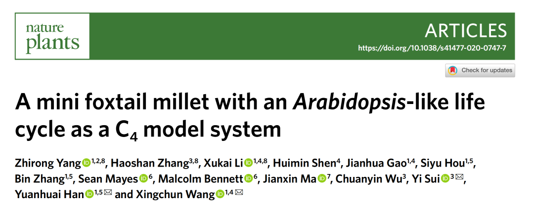 2020年8月31日,山西農(nóng)業(yè)大學(xué)雜糧分子育種團(tuán)隊與中國農(nóng)業(yè)科學(xué)院作物科學(xué)研究所等單位合作研究論文“A mini-foxtail millet with an Arabidopsis-like life cycle as a C4 model system”在線發(fā)表于國際期刊Nature Plants(IF:13.256),報道了C4禾谷類研究的理想模式植物“小米”的研究成果。山西農(nóng)業(yè)大學(xué)的楊致榮教授、中國農(nóng)業(yè)科學(xué)院作物科學(xué)研究所的張皓珊博士和山西農(nóng)業(yè)大學(xué)的李旭凱副教授為論文的共同第一作者;山西農(nóng)業(yè)大學(xué)的王興春教授、韓淵懷教授和中國農(nóng)業(yè)科學(xué)院作物科學(xué)研究所的隋毅副研究員為論文的共同通訊作者。美國普渡大學(xué)和英國諾丁漢大學(xué)等單位參與了部分研究。百邁客有幸參與了其中基因組、轉(zhuǎn)錄組及數(shù)據(jù)庫構(gòu)建工作。目前,數(shù)據(jù)庫由百邁客負(fù)責(zé)維護(hù)和運(yùn)行,暫時托管在公司服務(wù)器(http://foxtail-millet.biocloud.net/home)。