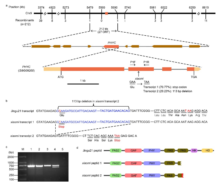 將“小米”基因組序列與經(jīng)基因組重測序生成的晉谷21基因組序列進(jìn)行比較,發(fā)現(xiàn)在定位區(qū)域只存在一個突變——“小米”基因Si9g09200的編碼區(qū)從“G”到“T”的突變,該基因編碼一種假定的PHYC蛋白(圖2a)。在所檢測的77個早期抽穗F2個體中,均為T/T純合突變體。相比之下,在256個晚抽穗個體中,92個是G/G WT純合子,另外164個是G/T雜合子,反映了基因型和表型之間的完美關(guān)聯(lián)。這種突變產(chǎn)生了一個終止密碼子,形成一個截短的蛋白質(zhì),占該基因約71%的轉(zhuǎn)錄本(轉(zhuǎn)錄本1)(圖2a-d)。這一突變還導(dǎo)致了113 bp的移碼缺失的剪接,形成了占該基因約29%轉(zhuǎn)錄本(轉(zhuǎn)錄本2)的截短蛋白(圖2a-d)。根據(jù)預(yù)測,被截斷的蛋白質(zhì)缺少第二個PAS結(jié)構(gòu)域的三分之二(肽1)或三分之一(肽2),以及整個HK和HD域(圖2d)。