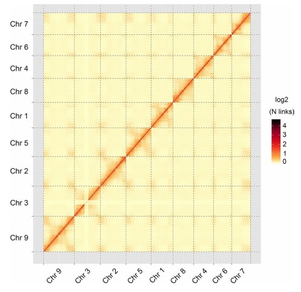 為了便于“小米”作為模型植物的使用,使用PacBio平臺組裝出429.94 Mb基因組 v1.0(k-mer預(yù)估438.26 Mb),contig N50高達(dá)18.8?Mb,Scaffold N50為42.41 Mb,并且僅包含48個Gap。其中399.4 Mb通過Hi-C錨定在9條染色體上(掛載率~93%;圖5)。根據(jù)Illumina DNA比對,組裝的錯誤率約為0.001%(每100kb有一個錯誤)。BUSCO評估結(jié)果為97.78%。這些結(jié)果表明“小米”基因組v1.0可以作為研究界的金標(biāo)準(zhǔn)參考。
