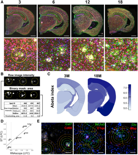 為了解基因表達(dá)的變化,作者進(jìn)行了兩個差異表達(dá)分析。首先比較AppNL-G-F?和 C57BL/6(基因模型),其次是Aβ沉積對基因表達(dá)的影響(Aβ模型)。作者使用6個轉(zhuǎn)錄本進(jìn)行經(jīng)典的RNA原位雜交實(shí)驗(yàn)來驗(yàn)證Aβ模型(圖2D&E),根據(jù)模型,18月齡的AppNL-G-F,Cst7,Cd68,C1qa,Slc1a3,Clu和Mbp表達(dá)異常。在圖2D中可以看到,ST的數(shù)據(jù)和RNA原位雜交數(shù)據(jù)高度相關(guān),這也證實(shí)了本方法的有效性。