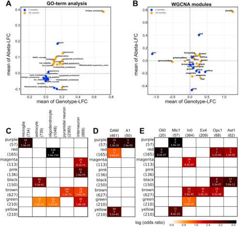 具有相似表達(dá)模式的基因很可能擁有相似的功能,因此可以通過加權(quán)基因共表達(dá)網(wǎng)絡(luò)分析(WGCNA)進(jìn)行模塊聚類。作者研究了10327個轉(zhuǎn)錄譜中變化程度*大的50%的基因,識別出12個模塊,并使用GOrilla提取了可能的生物學(xué)功能、Aβ暴露的表達(dá)變化、3月齡和18月齡的基因型、細(xì)胞特征、受影響的腦區(qū)。