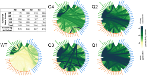 在WT中,所有PIGs的關(guān)聯(lián)相對較低,PIG被分為三個簇(圖5,綠、藍(lán)、橙)。ISS實(shí)驗(yàn)(圖4H)證明了在綠色簇中,星形膠質(zhì)細(xì)胞基因(7/12)富集,而藍(lán)色(14/23)和橙色(14/28)簇聚集了小膠質(zhì)基因中表達(dá)的PIGs。在WT中,橙色的PIGs幾乎不關(guān)聯(lián),而AppNL-G-F小鼠中,在接觸增長的Aβ后,這些PIGs的基因被招募。隨著Aβ指標(biāo)增長,PIGs內(nèi)部和相互之間的關(guān)聯(lián)增強(qiáng)。在Q4-Q1中,隨蛋白斑積累程度增加,互作關(guān)系明顯增加。