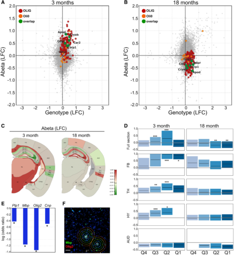 作者進(jìn)而更詳細(xì)地從Aβ指標(biāo)和OLIG表達(dá)的關(guān)系方面分析這些區(qū)域的不同。在圖2中,Aβ沉積隨疾病的進(jìn)展而不同。甚至在3個月時,有些TDs暴露于Aβ(圖5,Q1中179個TDs)。隨著Q4-Q2中TDs的Aβ緩慢增長,OLIG表達(dá)增加(圖6D)。但是,三月齡有著*高Aβ暴露(Q1,比Q4中Aβ高21倍)的TDs中OLIG的表達(dá)存在一種降低的趨勢。另外,低Aβ暴露的TDs中OLIG模塊的基因?qū)Φ倪B接強(qiáng)度之和*強(qiáng)。為了進(jìn)一步證明發(fā)現(xiàn),作者對三月齡AppNL-G-F小鼠的整個冠狀切片,設(shè)計四個OLIGs(Plp1、Mbp、Olig2Cnp)探針做RNA原位雜交(圖6E&F)。結(jié)果顯示,在三月齡小鼠稠密的淀粉樣蛋白斑周圍,這4個OLIGs明顯減少。可以推測,在輕度Aβ暴露下,OLIG模塊高表達(dá)和相互連接,但在高密度Aβ積累的微環(huán)境中表達(dá)減少。因此,部分OLIG模塊的區(qū)域差異與不同的Aβ暴露有關(guān)。