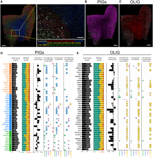 作者使用3名AD患者和3名正常對照組死后的人腦樣本進(jìn)行實(shí)驗(yàn)。AD大腦處于淀粉蛋白斑C階段和神經(jīng)元糾纏V-VI階段的疾病進(jìn)展期。研究描繪了與AD相關(guān)的額上回組織譜,總共報告了222個基因表達(dá)譜,包括45個人PIGs同源序列,OLIG模塊中42個斑塊反應(yīng)基因的同源序列,以及一系列細(xì)胞類型Marker。這些細(xì)胞Marker很好地在細(xì)胞分辨率下描繪了大腦區(qū)域(圖7A)。PIG模塊(圖7B,紫色)和OLIG模塊(圖7C,紅色)基因如預(yù)期的在大腦灰質(zhì)和白質(zhì)中富集。