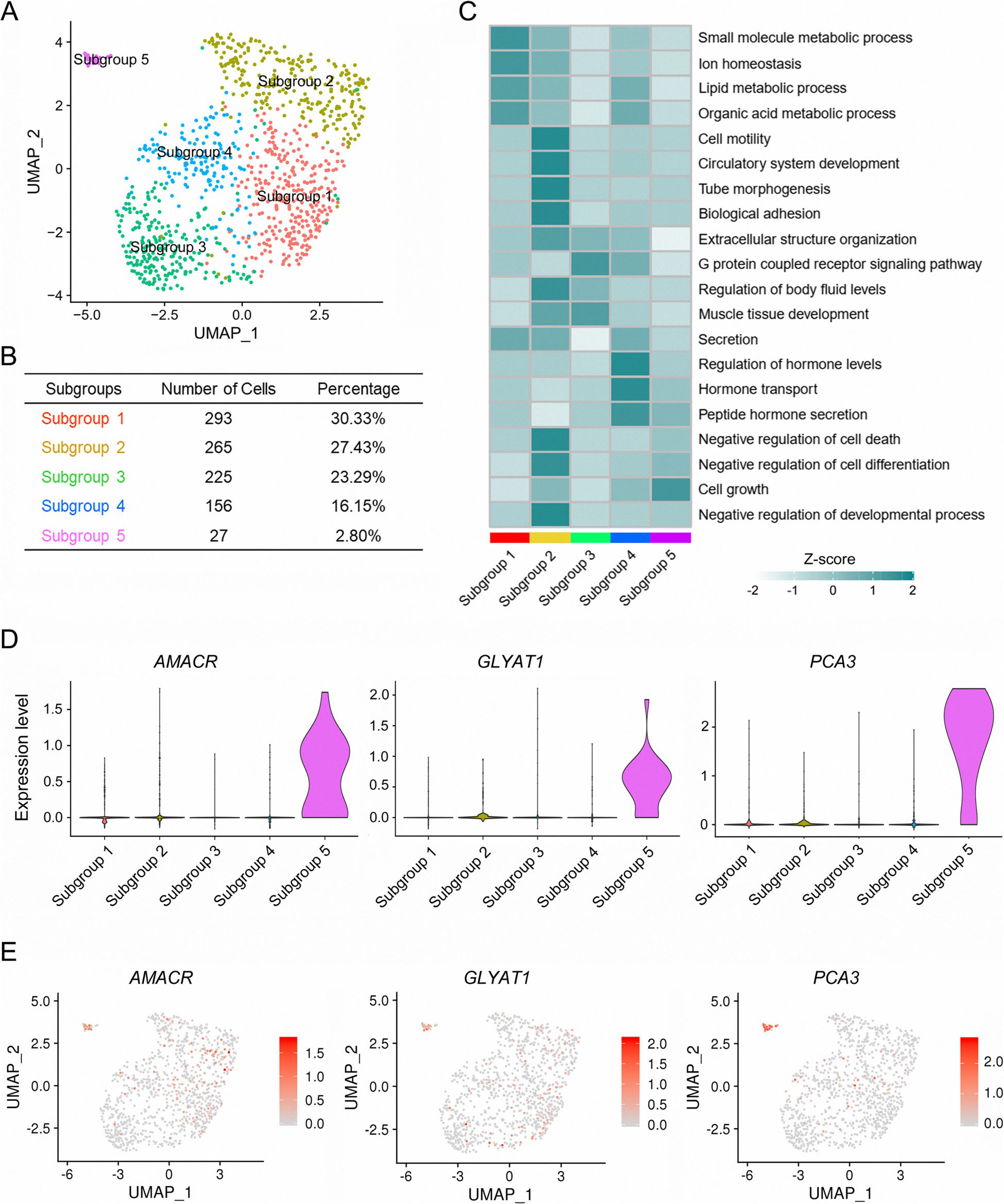 作者首先分析來自TCGA的公共PCa患者中每個(gè)管腔標(biāo)志基因的表達(dá)水平,以檢驗(yàn)它們與PCa發(fā)生和發(fā)展的臨床相關(guān)性。相比之下,大多數(shù)1型管腔標(biāo)記基因在惡性程度較低的前列腺癌中的表達(dá)高于惡性程度高或正常前列腺,這表明在前列腺癌的發(fā)生和早期發(fā)展中有潛在的作用(補(bǔ)充圖5)。因此,作者對(duì)1型管腔細(xì)胞進(jìn)行了亞聚類,以確定引起PCa的亞群。PCA將1型管腔細(xì)胞分為5個(gè)亞組(圖5a,b)。分析每個(gè)亞組標(biāo)記基因的功能富集,亞組1與腫瘤細(xì)胞有絲分裂準(zhǔn)備所必需的生物分子代謝過程有關(guān),如脂質(zhì)代謝過程和有機(jī)酸代謝過程(圖5c)。與其他亞組相比,亞組2與細(xì)胞運(yùn)動(dòng)、管形態(tài)發(fā)生和細(xì)胞死亡負(fù)調(diào)控有關(guān),這些過程對(duì)腫瘤的遷移和生長(zhǎng)至關(guān)重要(圖5c)。亞組3主要參與G蛋白偶聯(lián)受體信號(hào)通路和肌肉組織發(fā)育(圖5c)。第4亞組與PCa相關(guān)的過程,包括激素水平的調(diào)節(jié),激素轉(zhuǎn)運(yùn)和肽激素轉(zhuǎn)錄(圖5c)。相比之下,第5亞群的獨(dú)特功能主要集中在細(xì)胞生長(zhǎng)(圖5c)。VlnPlot和特征圖顯示,AMACR、甘氨酸鈉基轉(zhuǎn)移酶樣1(GLYATL1)和PCA3在5亞組中特異表達(dá)(圖5d,e)。有趣的是,AMACR是一種在前列腺癌中高度表達(dá)的過氧化物酶體酶,參與支鏈脂肪酸和膽汁酸中間產(chǎn)物的β-氧化,對(duì)PCa的發(fā)生和發(fā)展至關(guān)重要。PCA3是一種非編碼RNA,在PCa細(xì)胞系、原發(fā)組織甚至PCa患者尿液中高表達(dá)。這兩個(gè)5亞組的標(biāo)記物已經(jīng)被用于PCa的診斷和分層,這意味著5亞組可能是臨床上PCa診斷和分層所必需的一組不同的細(xì)胞。