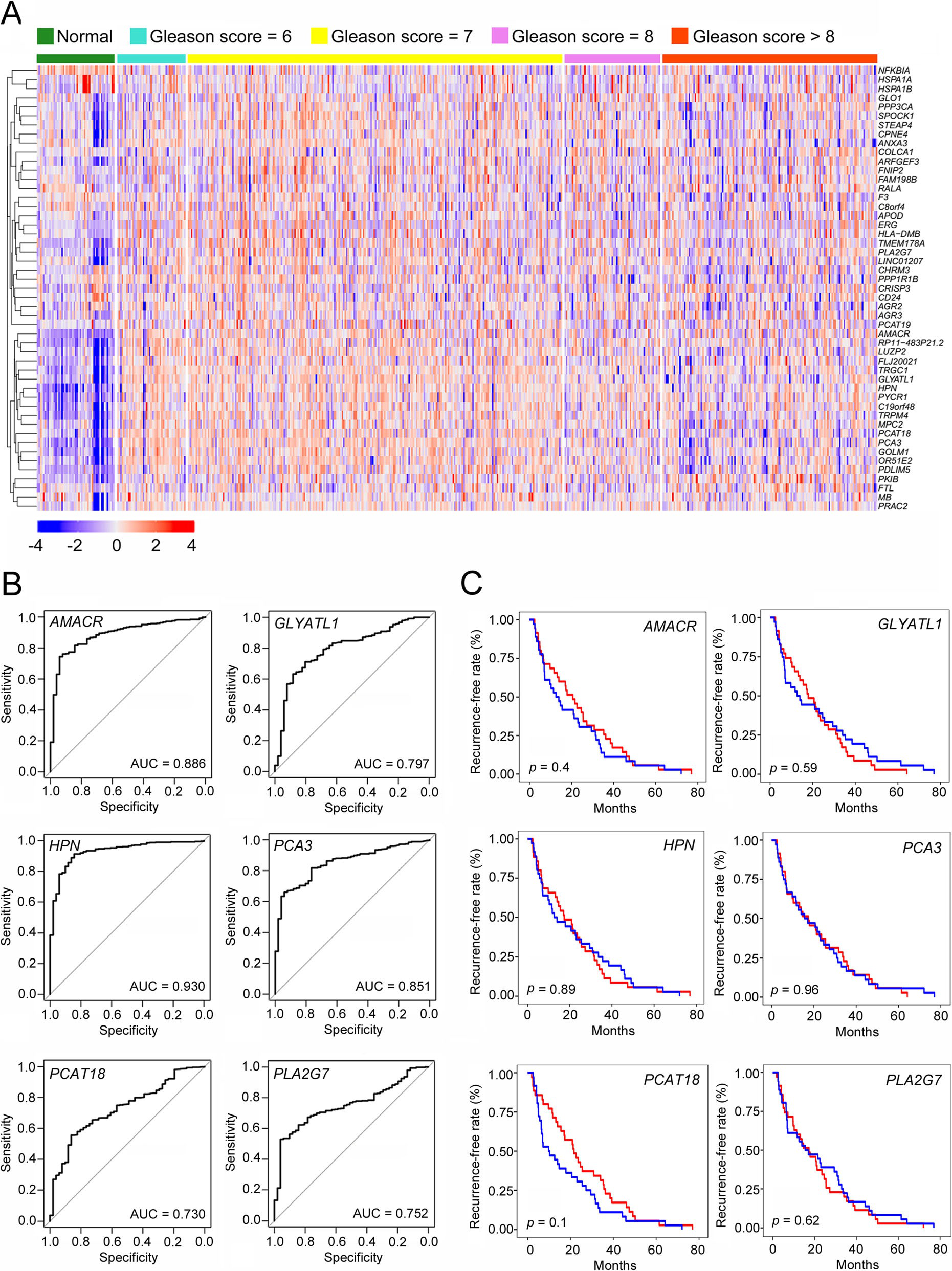 分析TCGA患者Ⅰ型管腔亞群的臨床相關(guān)性及其標(biāo)記基因的表達(dá)模式。正常前列腺中大多數(shù)1-4亞組標(biāo)記基因的表達(dá)水平與PCa組織中的相似甚至更高。相比之下,第5亞組的標(biāo)記基因在PCa組織中高表達(dá),尤其是在Gleason評(píng)分為6或7的患者中,這表明在PCa的發(fā)生和早期發(fā)展中有潛在的作用(圖6a)。通過ROC分析,我們進(jìn)一步鑒定了5亞組中6個(gè)特異性和敏感性最高的標(biāo)記基因,包括AMACR、GLYATL1、HPN、前列腺癌基因PCA3,前列腺癌相關(guān)轉(zhuǎn)錄物18(PCAT18)和磷脂酶A2第七組(PLA2G7)(圖6b)?;?-基因集的ROC分析顯示了很強(qiáng)的PCa預(yù)測(cè)能力,AUC得分為0.937。此外,這些基因的表達(dá)模式不僅區(qū)分了PCa與正常前列腺,而且區(qū)分了早期PCa(Gleason評(píng)分=6)和高度惡性PCa(Gleason評(píng)分≥8)。許多PCa患者在1-2年內(nèi)表現(xiàn)出抗藥性,并復(fù)發(fā)為晚期PCa,如CRPC。第5亞組可能有助于PCa復(fù)發(fā)。然而,Kaplan-Meier分析顯示,這些基因在生化復(fù)發(fā)中沒有明顯的預(yù)測(cè)能力,無論是單獨(dú)的還是作為一個(gè)基因集(圖6c)??傊?,第5亞組的惡性細(xì)胞是PCa診斷和分層的關(guān)鍵,但與生化復(fù)發(fā)無關(guān)。