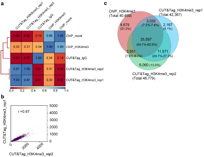 對CUT&Tag和ChIP數(shù)據(jù)進行相關性分析,發(fā)現(xiàn)CUT&Tag的兩個生物學重復(CUT&Tag_H3K4me3_rep1和CUT&Tag_H3K4me3_rep2)與對照CUT&Tag_IgG相關性非常低(r=0.01,Pearson’s correlation),表明CUT&Tag實驗組和對照組(背景噪音)存在顯著性差異(圖3,a),然而,ChIP_H3K4me3實驗組與ChIP_mock具有很高的相關性(r=0.89,Pearson’s correlation),這表明,ChIP分析中信號-噪音比例很高(圖3,a),而CUT&Tag實驗組的兩個生物學重復相關性近乎完美(r=0.97,Pearson’s correlation),說明不同的生物學重復之間重復性非常好(圖3,b)。