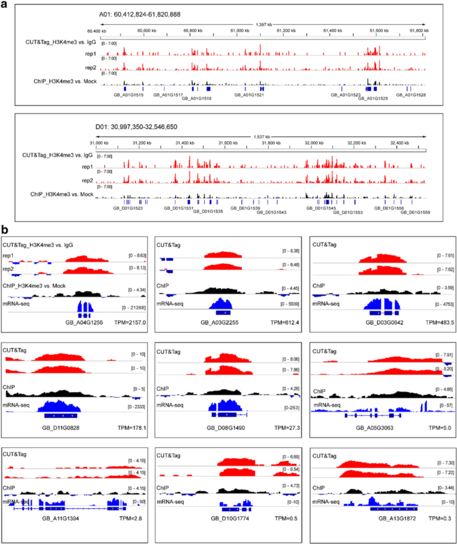 與熱圖顯示的強度一致,IGV截圖表明CUT&Tag信號在分辨率和靈敏度上的表現(xiàn)優(yōu)于ChIP(圖5,a),尤其在表達量相對低的基因中表現(xiàn)尤為明顯(如GB_A11G1394, GB_D10G1774, 和 GB_A13G1872;圖5,b)