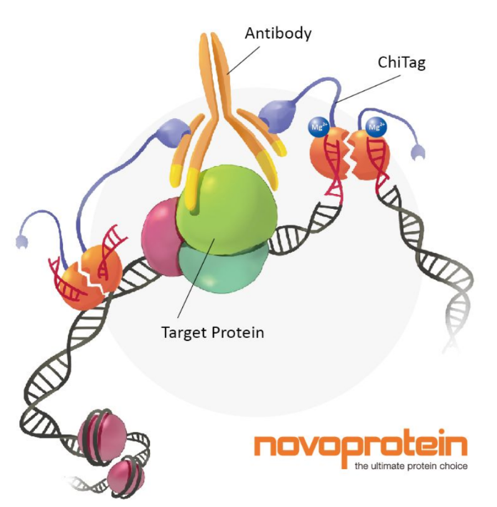 CUT&Tag使用Protein A與Tn5轉座酶的融合蛋白(ChiTag),在抗體的引導下,Protein A與染色質(zhì)上的目的組蛋白修飾標記、轉錄因子或染色質(zhì)調(diào)控蛋白結合,連帶的Tn5轉座酶對目的蛋白附近的DNA序列進行切割,并將測序接頭連接到切割片段的兩端(圖1),并釋放到細胞外,PCR擴增后直接用于高通量測序。