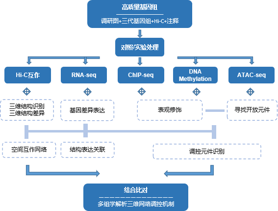表觀遺傳(epigentics) “epi”表示“其上”或“超越”,genetics只設(shè)計基因的結(jié)構(gòu)層次,而epigenetics則涉及基因如何發(fā)揮其功能以及基因間的互作關(guān)系?;蚪M結(jié)合表觀調(diào)控可更加深入的剖析物種在何時、何地、以何種方式去應(yīng)用遺傳信息的指令。多種表觀遺傳研究手段間可相互組合,從三維基因、修飾表達(dá)、調(diào)控元件等多種層面解析不同調(diào)控原理。
