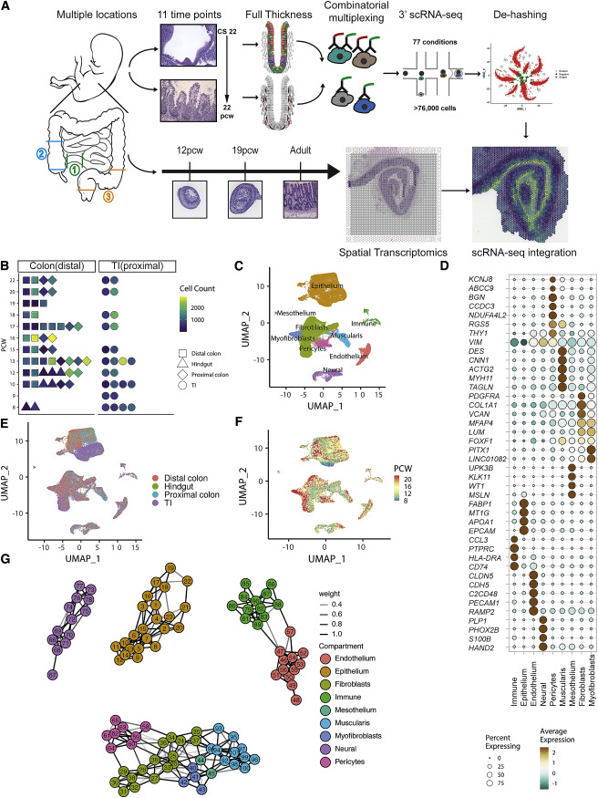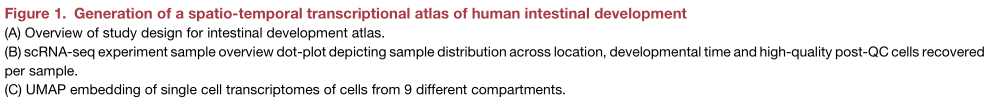 研究人員從代表了不同的發(fā)育時間和組織位置的17個單獨的胚胎中收集了77個腸道樣本繪制成單細胞圖譜 (Figures 1?A和1B),數(shù)據(jù)集范圍從8到22 PCW,跨越隱窩形成之前的時間點,直至成人狀絨毛/隱窩形態(tài)的發(fā)展(FiguresS1A)。使用寡核苷酸標記抗體,產(chǎn)生了76,592個細胞 (Figures 1A 和 S1B–S1I; STAR methods)。