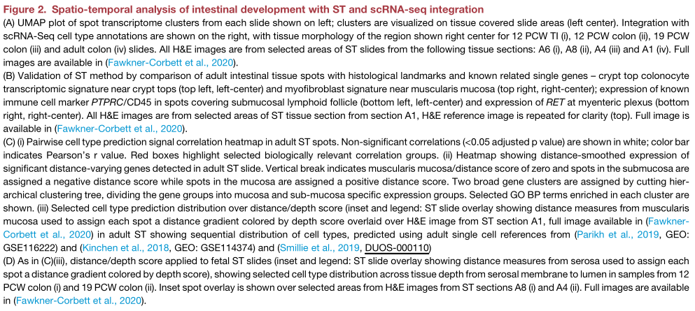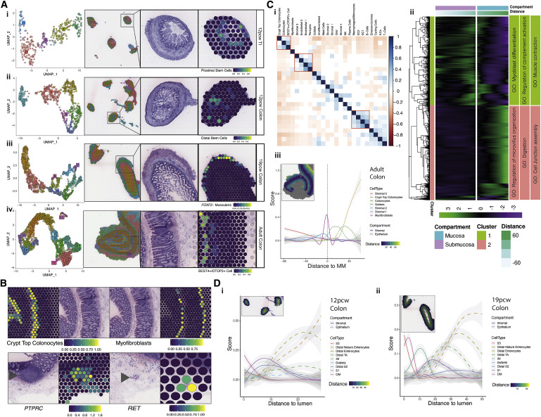 研究人員鑒定了2,893個與深度相關(guān)的基因(<5%FDR),反映了不同層次的活躍途徑(Figure Cii) -肌肉/神經(jīng)過程(收縮/軸突形成)向吸收管腔功能(微絨毛組織和消化系統(tǒng)過程)發(fā)展的深度富集點,與細胞類型特征的順序富集相符(Figure?2Ciii)。在胎兒ST顯著的差異包括外肌層和內(nèi)肌層在19個PCW時占據(jù)離散的空間層,而不是12個PCW時(Figure 2D)。