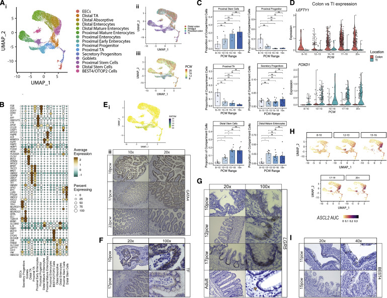 研究人員觀察到近端和遠端ISCs隨著時間的推移逐漸增加。這與ISC轉(zhuǎn)錄程序的早期位置差異形成對比,例如遠端LEFTY1和近端FOXD1及其下游調(diào)控網(wǎng)絡(luò)基因(Figure3C,3D和S3B)。這些差異由關(guān)鍵的位置信號轉(zhuǎn)通路支撐,例如,結(jié)腸LEFTY1通過激活素A受體(ACVR2B)參與了假定的神經(jīng)相互作FigureS3?C1)。在早期發(fā)育中(<12 PCW),研究人員發(fā)現(xiàn)了近端上皮干樣祖細胞群,該細胞群發(fā)展為早期腸上皮細胞。這些細胞表現(xiàn)出許多原始功能,包括在中胚層分化重要的VTN基因高表達,與ISCs相比,LGR5表達較少,和ONECUT2表達參與上皮發(fā)育(Figure 3B和FigureS3?D)。這些細胞在SI中特異表達TF GATA4(Figure3Ei), SI是一種小鼠早期內(nèi)胚層調(diào)節(jié)因子,在12 PCW后,其表達大部分丟失這些細胞高表達轉(zhuǎn)鐵蛋白(TF)( Figure3B和3F),證實了鐵代謝在絨毛形成中的重要性。LGR5是一種典型的ISC基因,在妊娠早期(<12 PCW)的近端/遠端廣泛檢測到低水平ISCs和干樣祖細胞(Figure3B和FigureS3D)。原位雜交(ISH)證實了在10PCW處彌漫的LGR5表達,后來定位于隱窩堿基(Figure3G),類似于在雞和小鼠發(fā)育中報道的Lgr5的行為。即使在隱窩形態(tài)建立之后(如19 PCW之后),ISC仍分別構(gòu)成遠端/近端樣本中捕獲的上皮細胞的18%–22%(Figure3C),高于成人結(jié)腸的scRNA-seq研究捕獲的3%-4%。與此相符,研究人員發(fā)現(xiàn)ASCL2?TF模塊(包括下游目標LGR5)隨著發(fā)育時間的增加而顯著增加(Figure3H)。