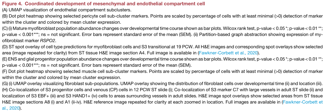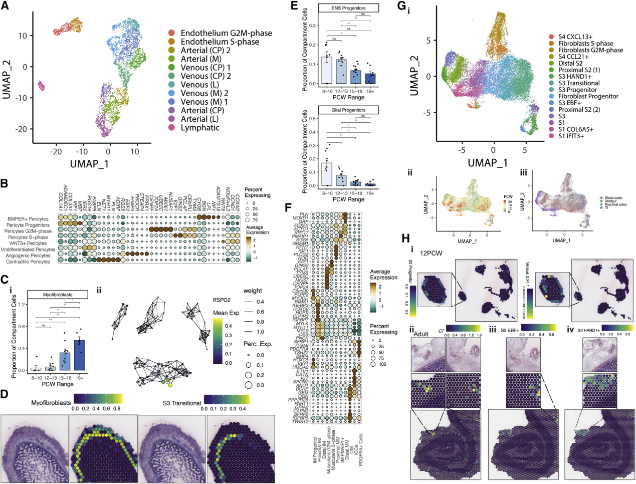 轉(zhuǎn)錄標簽通常對應(yīng)于結(jié)構(gòu)特征。在EC中可以清楚地看到這一點,將EC分為靜脈,動脈和淋巴管類型,并通過血管大小進一步區(qū)分(Figure4?A;TableS1)。在發(fā)育過程中,觀察到了從小血管到大血管的過渡,反映了腸道血管生成(Figure S4?A)。確定了驅(qū)動這種變化的TF網(wǎng)絡(luò),例如動靜脈分化器HEY1和SOX13。成年ST的脈管系統(tǒng)很容易識別成年EC和胎兒EC信號(Figure S4?B)。與EC相對的,周細胞亞型由血管生成驅(qū)動因子(PRRX1,THBS4和ANGPT2)定義(Figure 4?B;table S1)。ANGPT2是EC-周細胞RL相互作用的關(guān)鍵調(diào)節(jié)因子,已證實其位于胎兒脈管系統(tǒng)中(Figure S4C)。盡管EC隔室與8 PCW處存在的大血管細胞截然不同,但周細胞種群顯示出發(fā)育滯后。為了了解這些分化動力學(xué),研究人員將G2M和S期周細胞與G1期細胞進行了比較,發(fā)現(xiàn)在較早時間點的大多數(shù)細胞是高度循環(huán)的祖細胞(Figure S4?D)。這些種群與成纖維細胞和原始的ACTA2?+細胞共享轉(zhuǎn)錄特征,這一結(jié)果受到軌跡分析的支持(Figure S4?E)。綜上所述,提出了早期成纖維細胞向周細胞的轉(zhuǎn)變,然后是來自未成熟WNT6表達細胞的第二波周細胞增殖-分化。16 PCW時,成熟的成肌纖維細胞表現(xiàn)出相似的發(fā)育滯后(Figure 4?Ci;table S1)。文獻表明腸道成肌纖維細胞可能來自多種來源,并且圖形抽象顯示成熟的成肌纖維細胞類似于肌肉細胞,在特定基因(例如RSPO2,F(xiàn)igure 4?Cii)中存在明顯差異。然而,肌成纖維細胞祖細胞卻表現(xiàn)出來自成纖維細胞和周細胞的梯度譜;在19 PCW的ST中,它們占據(jù)了與過渡間質(zhì)細胞相鄰和重疊的層。(Figure 4?D和S4?E)。