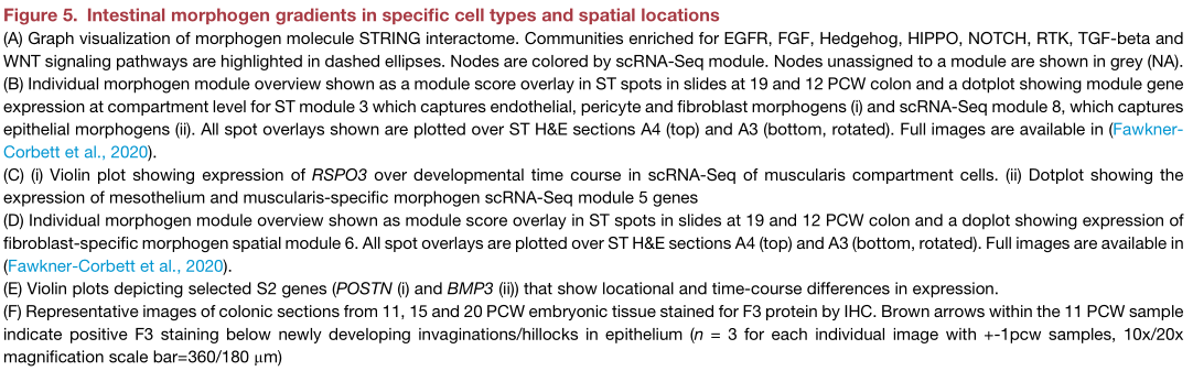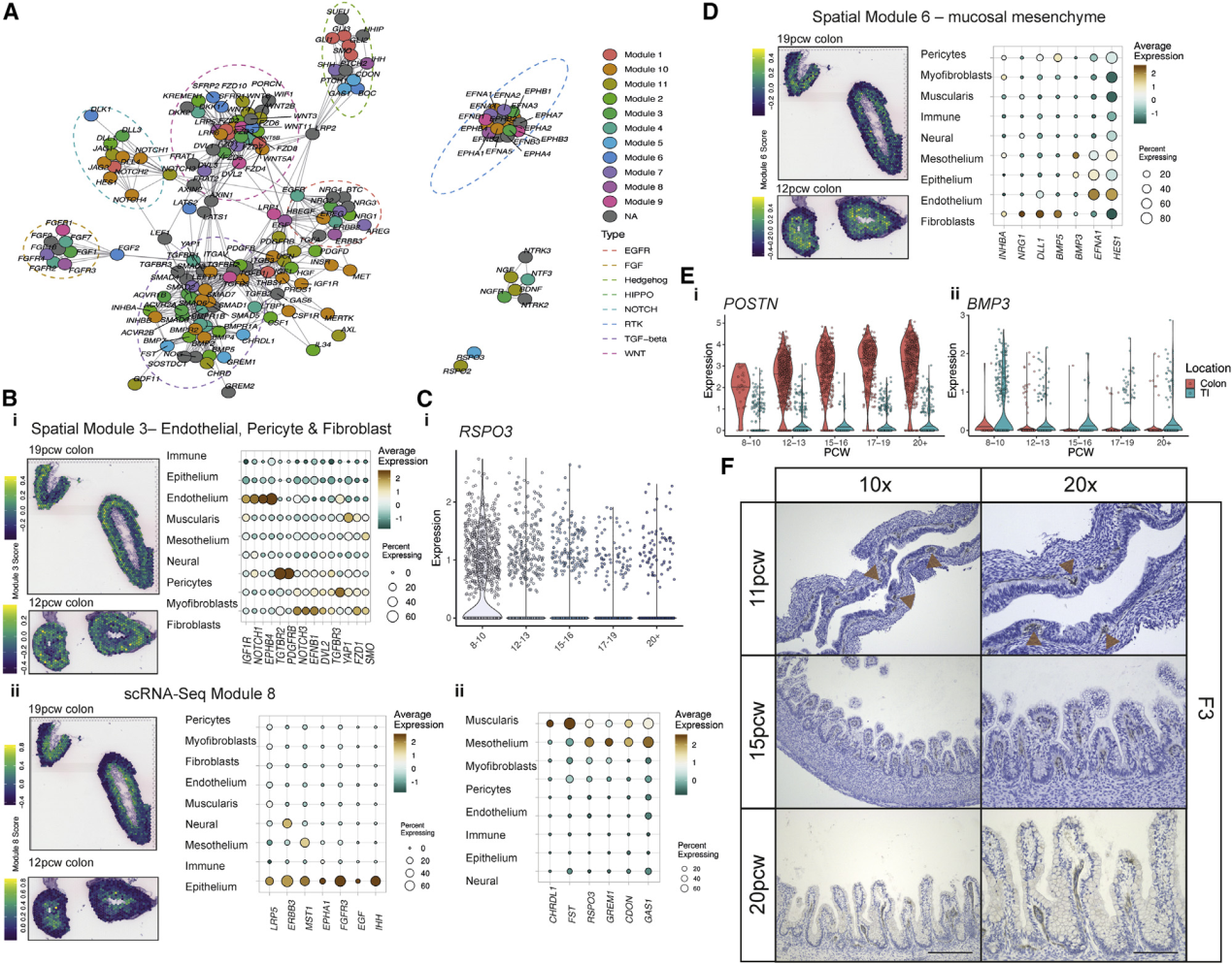 理解腸道發(fā)育的基本問題是局部形態(tài)發(fā)生梯度及其拮抗劑是如何塑造腸絨毛形態(tài)發(fā)生的。研究人員創(chuàng)建了一個涉及8條途徑的基因形態(tài)發(fā)生圖,用以闡明這些分子在空間和時間上的作用。利用共表達分析確定了11種細胞類型特異性和13種空間共定位的形態(tài)發(fā)生模塊,在所有ST中對模塊活性進行了評分(Figure5A和S7?A)。這些模塊通常與ST中的組織深度對齊,空間模塊3由來自EC、成纖維細胞和周細胞起源的形態(tài)發(fā)生子組成,包括LRP1,并且在組織深處(Figure5?Bi)。上皮特異性模塊表達了Hedgehog通路(IHH)的基因,例如在Wnt信號中起重要作用的卷曲的共受體LRP5,并位于管腔附近(Figure5?Bii)。另一個含有肌纖維母細胞成分的細胞,具有形態(tài)發(fā)生原WNT2B和受體RSPO2,在12PCW時出現(xiàn)彌漫性,并在以后逐漸定位(FigureS7?B)。這與發(fā)現(xiàn)成熟的成肌纖維細胞在上皮成分后出現(xiàn)的發(fā)現(xiàn)一致,表明ISC-成纖維細胞信號傳導(dǎo)回路直到隱窩形成后才建立。WNT2B由間皮表達,在成肌纖維細胞分化之前提供了配體的唯一來源(FigureS7B)。類似地,RSPO3,其可以用信號通知經(jīng)由ISC的LGR5(FigureS7Ci)在間皮/肌層模塊中很高,主要在12 PCW之前見到,然后隨著時間的流逝隨著組織深度的增加而消失(Figure5C)。這表明,隨著腸的生長,原本可能因?qū)娱g物理距離的增加而被打破的形態(tài)梯度,可以通過依次發(fā)育的細胞類型的表達而恢復(fù)。
