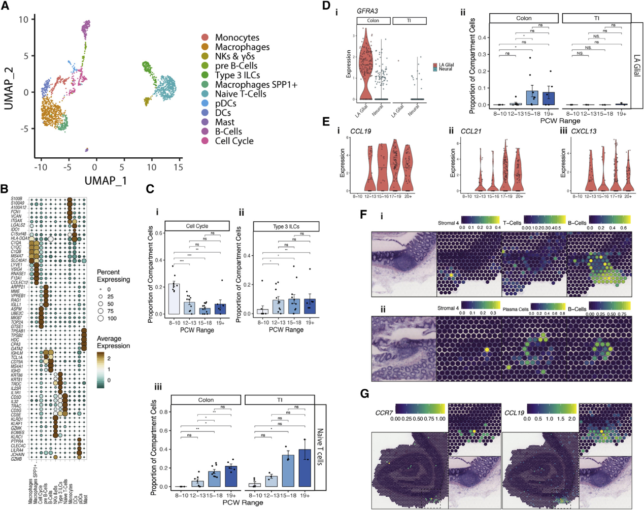 胎兒ILC3表達IL7RA和ID2(TableS1),這對小鼠子宮Peyer’s斑塊(PPs)的形成至關(guān)重要,因此將這些細胞區(qū)分為3型淋巴組織誘導(dǎo)劑(LTi)。PP的形成是一個LTi細胞、EC和基質(zhì)細胞之間相互協(xié)調(diào)作用的過程。此外,鼠類研究顯示其還需要RET/ARTN/GFRA3神經(jīng)軸,而GFRA3缺乏會導(dǎo)致PP發(fā)育受損。腸道相關(guān)淋巴樣組織(GALT)的形成被認為在出生前以PPs的形式出現(xiàn)在SI體內(nèi),而在出生后以結(jié)腸的形式出現(xiàn)。相反,在此,研究人員確定了一個獨特的結(jié)腸而不是SI特異的神經(jīng)膠質(zhì)種群,它是發(fā)育過程中唯一的GFRA3來源,并在15 PCW時擴展(Figure6 D),表明在人類結(jié)腸發(fā)育過程中可能存在類似的神經(jīng)免疫回路。