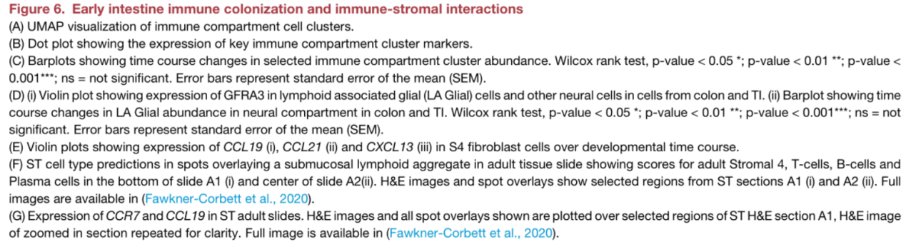 為了在空間上確認這些相互作用,研究人員研究了成人ST,其中粘膜下淋巴濾泡被視為獨特的結(jié)構(gòu)。S4和免疫細胞(例如CD3和CD19)的關(guān)鍵標記基因在這些卵泡中和周圍表達,因子分析證實了各種成年免疫細胞(B細胞,T細胞和髓樣細胞)和此處定位的S4細胞類型(Figure6) F)。研究人員還發(fā)現(xiàn)ST中關(guān)鍵RL對的顯著共定位(包括CCR7 / CC19(1個點內(nèi)p = 1.098×10 -10,半徑內(nèi)p = 5.59×10 -49)(Figure6G)。表明S4細胞是成年結(jié)腸中與卵泡相鄰的成纖維細胞,在胎兒GALT發(fā)育過程中以時間依賴性方式出現(xiàn)。