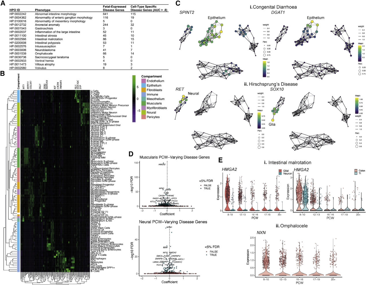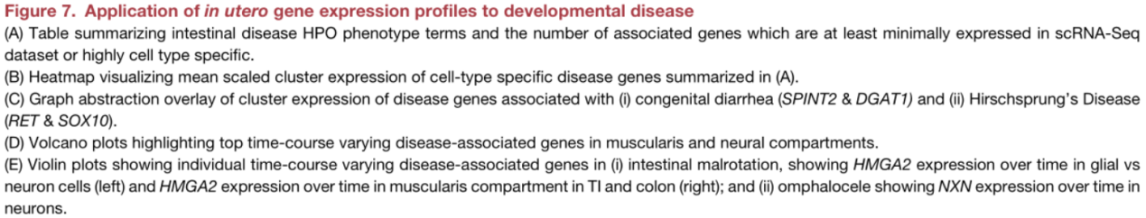 該研究在時間方面允許研究隨著發(fā)育時間而變化的疾病基因(Figure7D),并可以提供與時間相關(guān)的信息,突出顯示PCW前12膠質(zhì)細胞和IM祖細胞表達的基因HMGA2(分別為FDR<2.2e-16)(Figure7Ei),與腸道旋轉(zhuǎn)不良有關(guān)(12q14微缺失綜合癥,ORPHA:94063)。同樣,早期抑制運動神經(jīng)元特異的NXN的致病變體(Figure7Eii)會導(dǎo)致卵泡擴張(Robinow綜合征,OMIM:618529)。在此發(fā)育時期,腸子回到了腹部,表明ENS細胞和肌肉祖細胞可能對該過程至關(guān)重要。