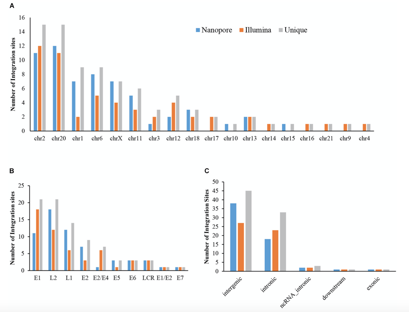 在Illumina測序獲得的54個整合位點中,有19個與之前報道的相符。整合所有位點并做韋恩圖(圖4),有13個位點是3種數(shù)據(jù)(Nanopore、Illumina、published)都存在的,這表明不同平臺間重復(fù)性很好。共有18個位點同時出現(xiàn)在Nanopore和Illumina中,三個位點同時出現(xiàn)在納米孔測序和以前發(fā)表的論文中,只有一個位點在Illumina和已發(fā)表的論文重疊。在兩個平臺中確定的整合位點中,一些斷點具有高度豐富的reads數(shù),例如HPV16:2804,chr20:32516985,Nanopore結(jié)果中有406個reads,Illumina結(jié)果中有1439個reads。其他斷點的reads數(shù)很少,例如HPV16:4250,chr21:97550764,其中Nanopore結(jié)果中有兩個reads,而Illumina結(jié)果中只有四個reads。